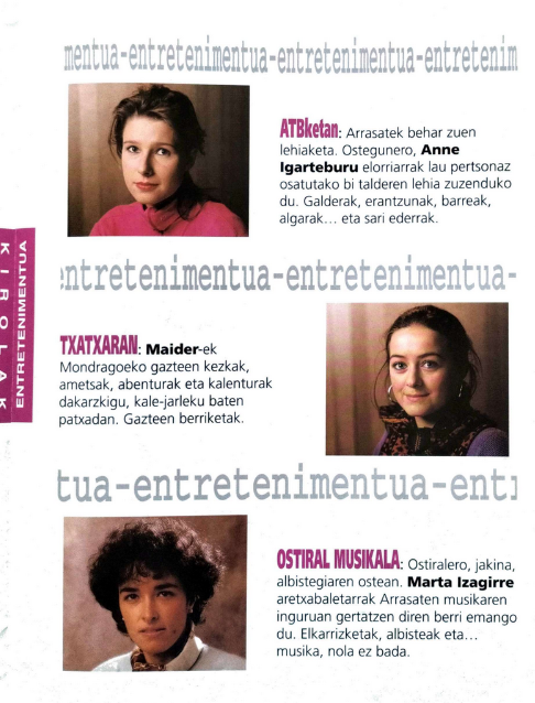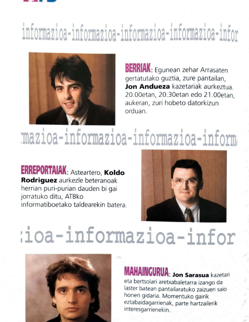 Lainoak laino, argi geneukan gure telebistak ezin zuela xumea izan, seinalearen kalitatea eta kantitatea besteekin lehiatzeko modukoak behar genituela. Hori lortzeko, aholkularitza eskatu genion Asier Aranguren ETBko kazetari atxabaltarrari; berak prestatu zigun parrila oso anbiziotsu bat, eta haren aurkezpen publikorako ekitaldi distiratsua antolatu genuen Eskola Politeknikoan, ATBOOM! izen argigarriarekin. Helburu nagusia ikusleak inpresionatzea izanik, ekitaldia oso ‘hollywoodiarra’ izan zen: parrillako saioen aurkezleak (Anne Igartiburu, Maider Egues, John Andueza, Jon Sarasua…) bakoitza berearen berri ematen, promo batekin, eta batetik bestera musika emanaldi laburrak (Goikobalu, Arrasate Musikal…) Nik ordurako hurbileko nituen Ruper Ordorika eta Joseba Tapia; eta banekien elkar miresten zutela. Horregatik proposatu nien elkarrekin bizpahiru kantu jotzea gure ekitaldian eta hala egin zuten. Sinetsita nago hurbiltze honek zerikusirik izan zuela Hiru Truku taldearen sorreran.