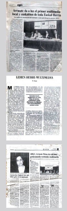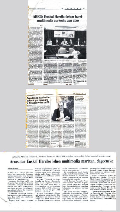 Arrasate nekez izaten zen albiste komunikabide nazionaletan, baina hainbeste mugimendurekin lortu genuen Gipuzkoan behintzat zarata apur bat ateratzea, eta tarteka bisitak izaten genituen ARKOn. Gogoan dut nola etorri ziren orduantxe jaiotzen ari zen Urnietatel proiektuko kideak, zuntzaren eskaintza indartzeko toki telebista bat antolatu nahi zutelako; eta baita Zumarragako zinegotzi gazte argal bat, oharrak zintzo hartu eta joan zena. Gerora famatu zenean ohartu nintzen bisitari hura Josu Jon Imaz izan zela.