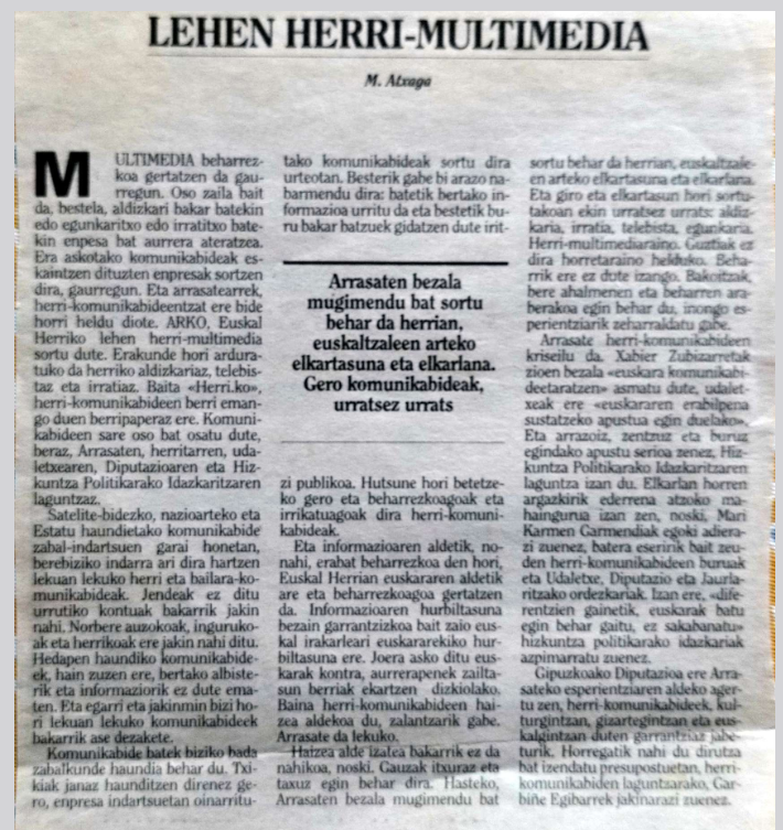 Antolamendua eta baliabideak bezain garrantzitsua zelakoan, ahalegin berezia egin genuen bi komunikabiden ikuspegi partekatuari forma emateko. Eta multimedia kontzeptuan aurkitu genuen giltza. Kontua ez zen aldizkari bat edo telebista bat egitea, baizik eta talde multimedia bat sortzea, hizkuntzaren eta komunitatearen premiei behar bezalako erantzuna emateko gai izango zena. Horrela, bageneukan helburu komun objektibo bat medio ezberdinetako langileentzat, eta lausotuz joan ziren auto-pertzepzioak. Hau lezio oso probetxugarria izan dut gero ere: bi aukeren artean jarrerak aurrez-aurre daudenean, ez da oso mesedegarri bataren edo bestearen alde egitea, nekez iristen da adostasuna horrela; askozaz eraginkorragoa da dikotomiari ate berriak irekitzea, bestelako aukerak bilatzea eta triangeluen bidez joko-zelaia aldatzea. Uste dut denborarekin espezialista bihurtu naizela gaitasun honetan.