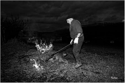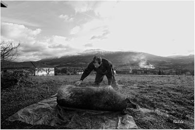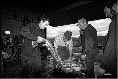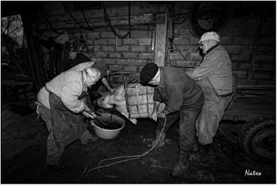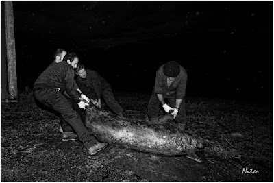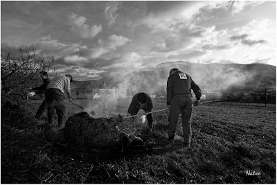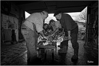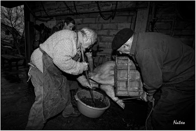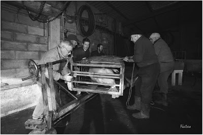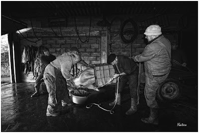 Desde que el gancho es introducido en la papada y queda visible y tenso el cuello, hasta que se desangra, pasan unos pocos minutos, que a mí se me hicieron eternos.