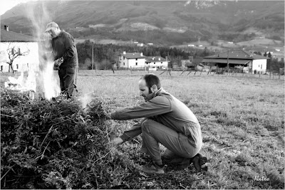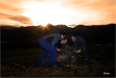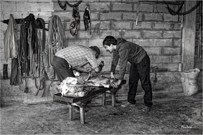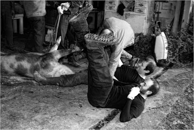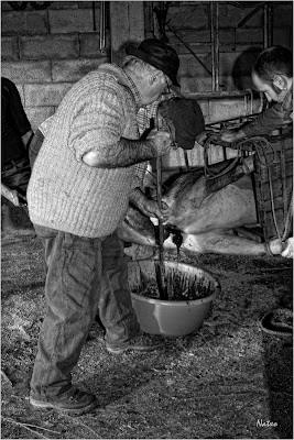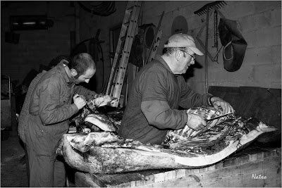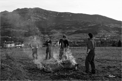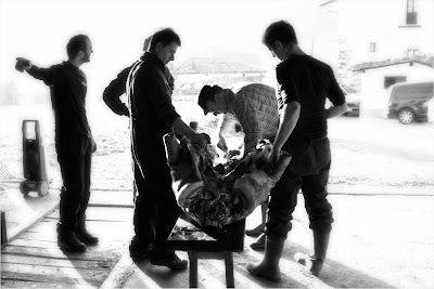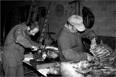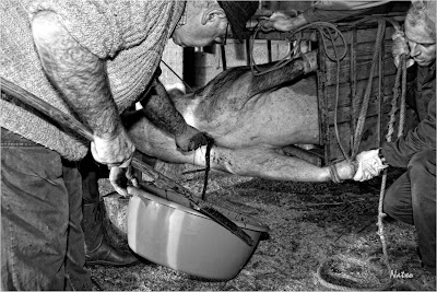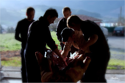 De nuevo se junta la familia, son tres los animales que se van ha sacrificar, todo esta preparado y cada uno sabe cual es su trabajo. Hoy falta el más veterano y se le echa en falta, pero han venido algunos jóvenes que aportaran sus fuerzas y todo lo que se les indique.