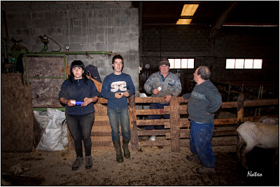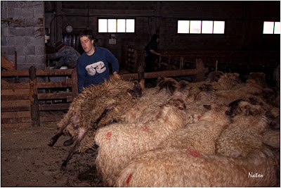 Dos Bizkainos profesionales con las tijeras eléctricas, empezaron su trabajo a primera hora de la mañana, otros tenían otro papel, recogían la lana y los demás sujetaban a la siguiente oveja, era una cadena que no paraba, hasta que llego la hora del hamarretako.