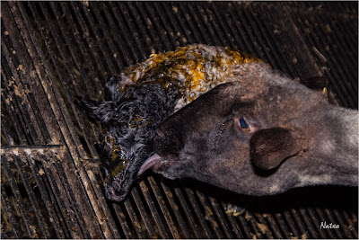 El esquilador trabaja con todo su cuerpo para que el animal quede inmóvil, la rapidez de estos me dejo sorprendido, cogí el reloj y cronometre, 2´ y 19´´.