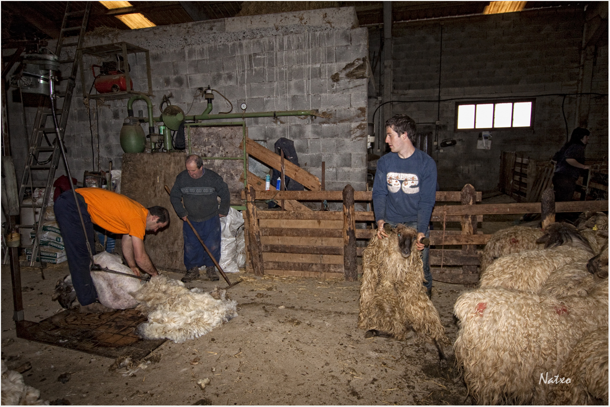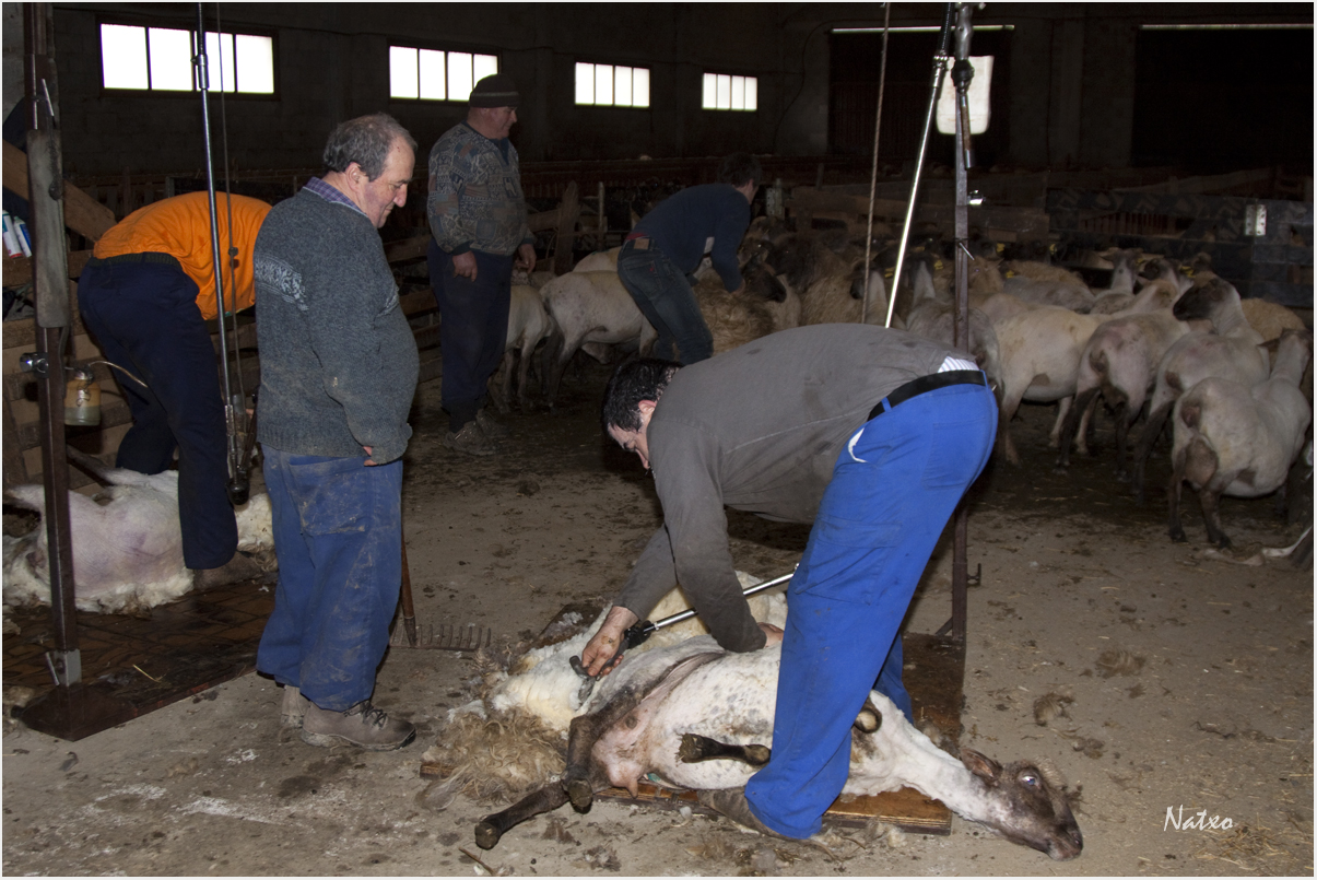 Dos Bizkainos profesionales con las tijeras eléctricas, empezaron su trabajo a primera hora de la mañana, otros tenían otro papel, recogían la lana y los demás sujetaban a la siguiente oveja, era una cadena que no paraba, hasta que llego la hora del hamarretako.