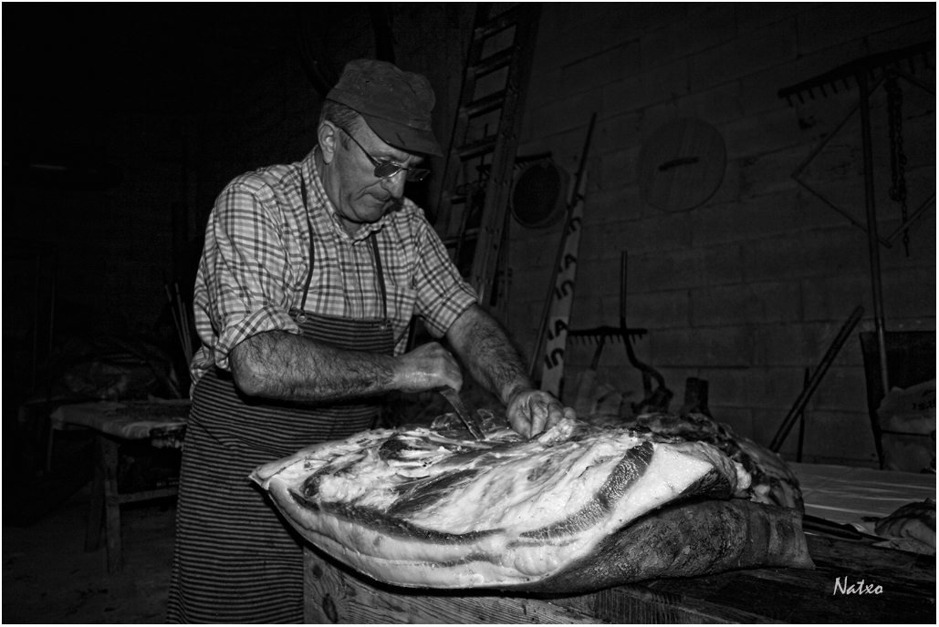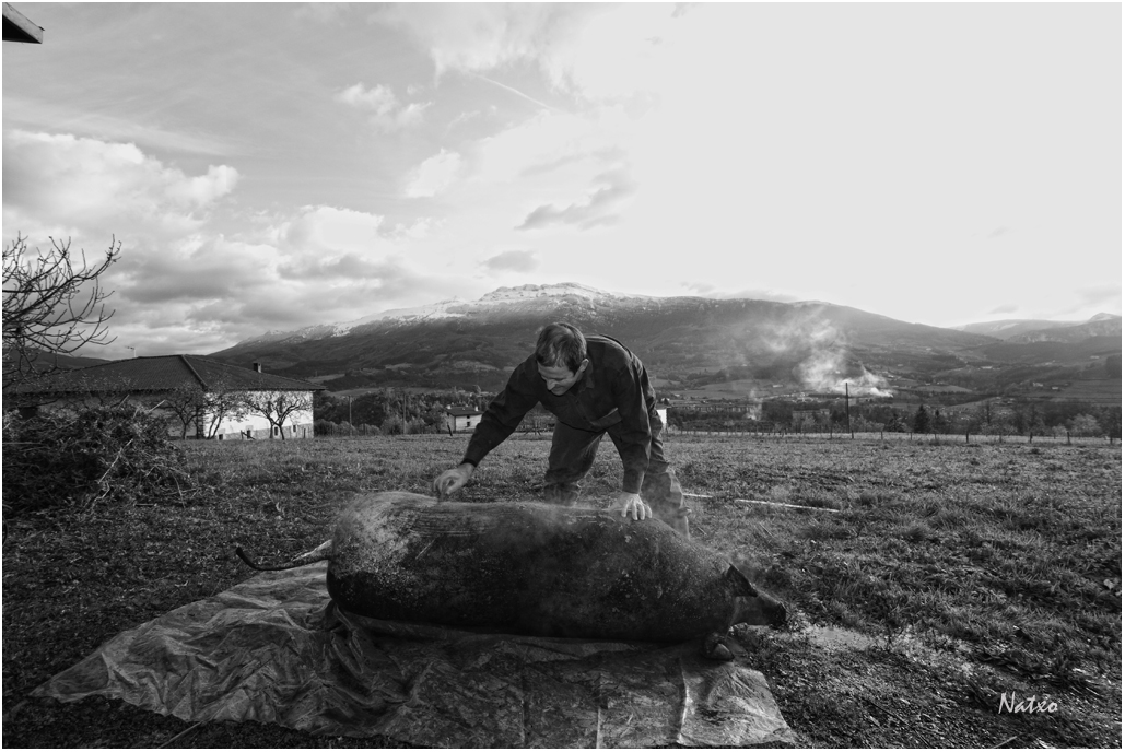 Desde que el gancho es introducido en la papada y queda visible y tenso el cuello, hasta que se desangra, pasan unos pocos minutos, que a mí se me hicieron eternos.